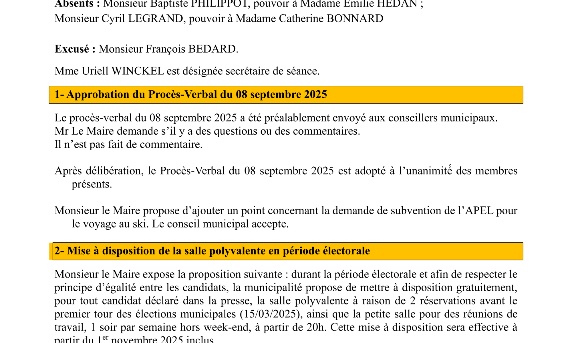 Compte-rendu du Conseil Municipal du 08 septembre 2025